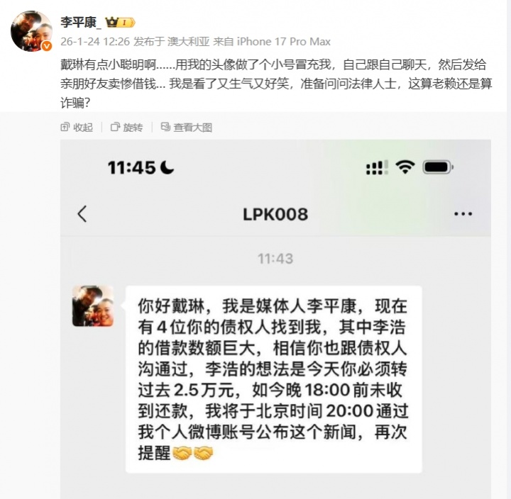 李平康写道:“戴琳有点小聪明啊……用我的头像做了个小号冒充我,自己跟自己聊天,然后发给亲朋好友卖惨借钱… 我是看了又生气又好笑,准备问问法律人士,这算老赖还是算诈骗? ”